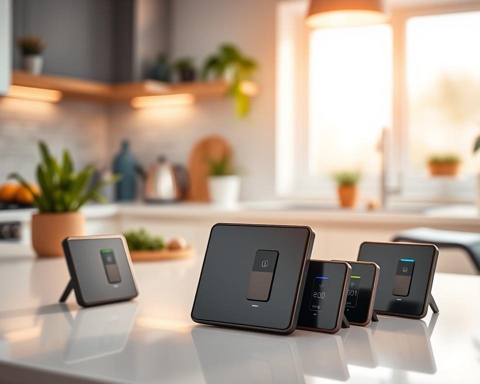 A collection of sleek, modern smart mini switches displayed on a clean, minimalist kitchen countertop. The switches have a glossy finish, featuring touch-sensitive controls and LED indicators that glow softly in various colors. In the foreground, focus on a few switches arranged artistically, showcasing their unique designs and innovative features. The middle ground includes ambient kitchen elements like a stylish kettle and greenery, reflecting a smart home environment. For the background, use a softly lit kitchen setting with warm and inviting natural light streaming in from a window, emphasizing a comfortable and modern atmosphere. The mood should feel futuristic yet approachable, highlighting the seamless integration of technology in everyday life. Capture the scene using a shallow depth of field to create a gentle bokeh effect, drawing attention to the switches.