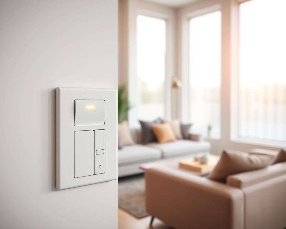 A modern living room featuring smart mini switches elegantly placed on the walls. In the foreground, focus on a close-up of the sleek, stylish mini switches with illuminated indicators showing their smart functionality. In the middle ground, a cozy sofa with contemporary design and a small table with smart home devices like a voice assistant and smart bulbs enhances the smart ambiance. The background displays large windows letting in natural light, giving a warm and inviting atmosphere. The overall lighting is soft and evenly distributed, showcasing the benefits of smart technology. Aim for a clean, minimalist aesthetic that embodies the convenience and innovation of smart mini switches, capturing a harmonious blend of technology and home comfort.